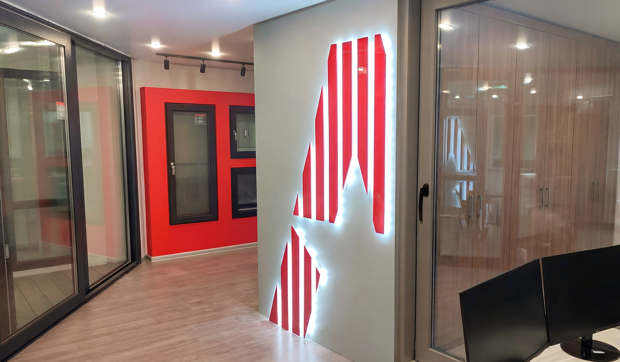 Здесь вы можете посмотреть образцы окон и дверей из ПВХ и алюминия, портальные конструкции, протестировать свойства шумоизоляционных и энергоэффективных стеклопакетов, а также получить консультацию и расчет от специалистов отдела продаж.